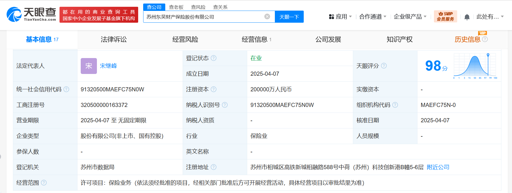 南方财经4月9日电,天眼查App显示,近日,苏州东吴财产保险股份有限公司成立,法定代表人为宋继峰,注册资本20亿人民币,经营范围为保险业务。股东信息显示,该公司由苏州国际发展集团有限公司、苏州新城投资发展有限公司、苏州交通投资集团有限责任公司、苏州高新国有资产经营管理集团有限公司、协鑫能科(002015)等共同持股。