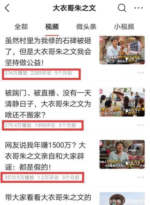 我们看看朱之文以往发表的视频,上面是显示播放量的,做自媒体的人都知道,只要有播放量,就可以看出大致的收入了。